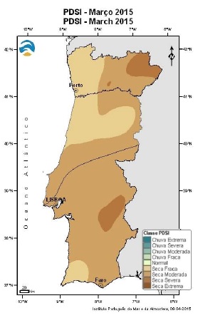 Em 31 de Março de 2015 e segundo o índice meteorológico de seca PDSI, verifica-se um agravamento da seca, estando todo o país, em situação de seca: cerca de 93 % do território em seca fraca a moderada e cerca de 7 % em seca severa (alguns locais do Alentejo e de Trás-os-Montes).