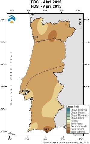 Em 30 de Anril de 2015 e segundo o índice meteorológico de seca PDSI, mantém-se a situação de seca meteorológica em todo o território, verificando-se em relação ao final de março um aumento da área em seca moderada na região Norte e Centro e uma diminuição da mesma classe na região Sul.