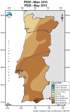 Em 31 de maio de 2015 e segundo o índice meteorológico de seca PDSI, mantém-se a situação de seca meteorológica em todo o território que se verifica desde março. No final de maio verifica-se um agravamento da intensidade da seca em quase todo o território exceto no litoral Norte, estando agora grande parte do território nas classes de seca moderada e severa.