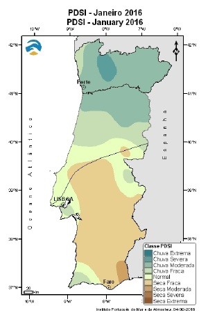 De acordo com o índice meteorológico de seca PDSI, no final de Janeiro diminuiu a área em situação de seca meteorológica e aumentou as classes de chuva.