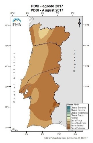 De acordo com o índice meteorológico de seca PDSI, no final do mês de Agosto, mantém-se a situação de seca meteorológica em todo o território de Portugal Continental, verificando-se um desagravamento da área em seca severa e extrema.