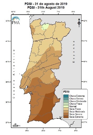 Assim, no final de Agosto, 98.8% estava em situação de seca meteorológica, sendo que cerca de 34.9% estava nas classes de seca severa e extrema.
