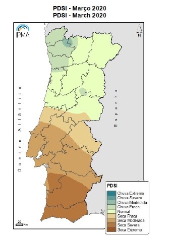 De acordo com o índice PDSI, no final de Março, verificou-se uma diminuição da intensidade da seca meteorológica nas regiões a sul do Tejo, onde já não existe nenhum local em seca extrema, mantendo-se porém o Baixo Alentejo e Algarve em seca severa.
