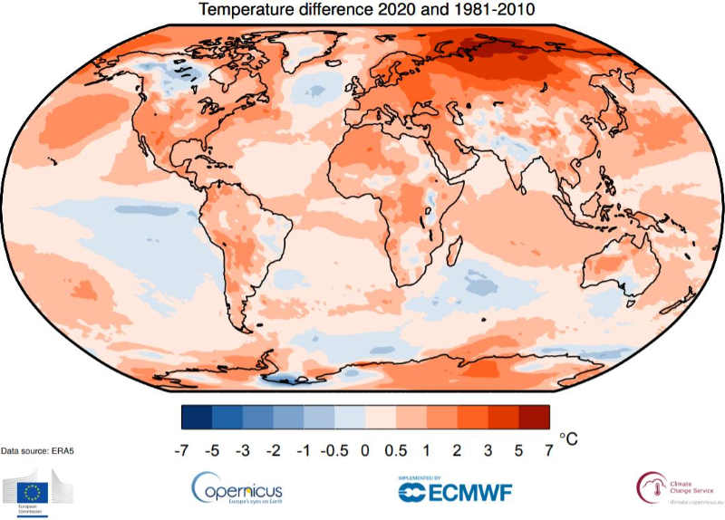 De acordo com o Copernicus Climate Change Service (C3S) 2020 foi o ano mais quente a nível global, igualando 2016, e na Europa: