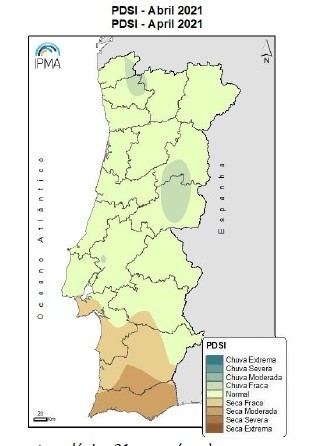 De acordo com o índice PDSI, no final de Abril, verificou-se um aumento da área e da intensidade da seca meteorológica na Região Sul, com toda a região do Algarve em seca moderada.
