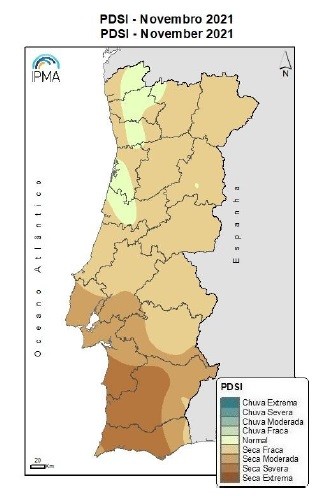 De acordo com o índice PDSI, no final de Novembro, verificou-se um aumento significativo da área em seca meteorológica em todo o território e um aumento da intensidade na Região Sul, com alguna locais dos distritos de Setúbal, Beja e Faro na classe de seca severa.