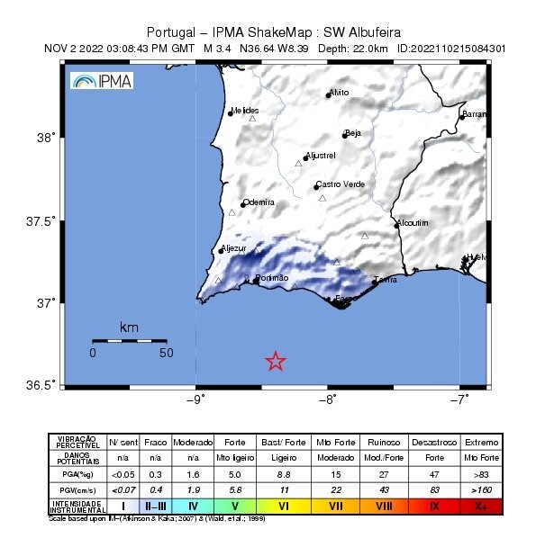 O Instituto Português do Mar e da Atmosfera informa que no dia 02-11-2022 pelas 15:08 (hora local) foi registado nas estações da Rede Sísmica do Continente, um sismo de magnitude 3.4 (Richter) e cujo epicentro se localizou a cerca de 50 km a Sul-Sudoeste de Albufeira.