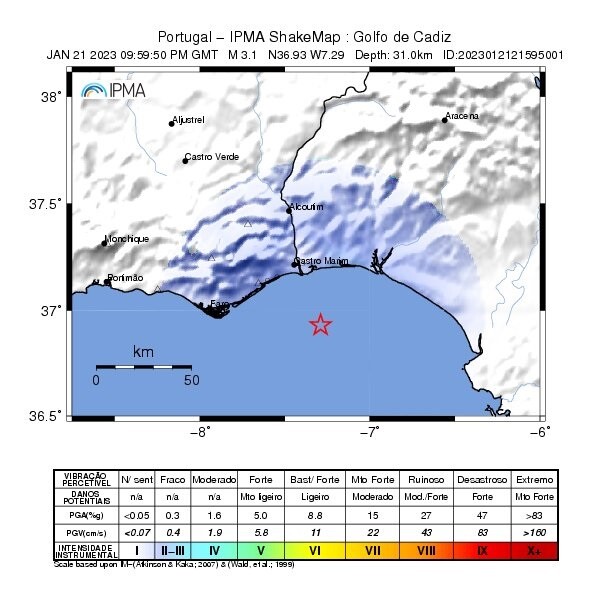 O Instituto Português do Mar e da Atmosfera informa que no dia 21-01-2023 pelas 21:59 (hora local) foi registado nas estações da Rede Sísmica do Continente, um sismo de magnitude 3.1 (Richter) e cujo epicentro se localizou a cerca de 30 km a Sul-Sudeste de V.R.Sto António.