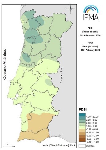 De acordo com o índice PDSI, no final de Fevereiro, verificou-se uma ligeira diminuição da área em seca meteorológica no Baixo Alentejo e no Algarve e uma diminuição significativa da intensidade no Sotavento Algarvio.