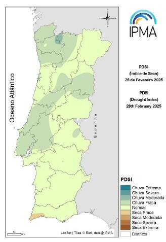 De acordo com o índice PDSI, no final de Fevereiro, verificou-se uma diminuição significativa da área que se encontrava em seca meteorológica, na classe de seca fraca, permanecendo apenas uma pequena parte do Barlavento Algarvio.